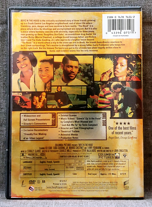Boyz N The Hood – 2 Disc Anniversary Edition – Directed By Jon Singleton – Starring Ice Cube, Cuba Gooding JR, Morris Chestnut, Angela Bassett, Larry Fishburne – 1h52min – Columbia Pictures – 1991