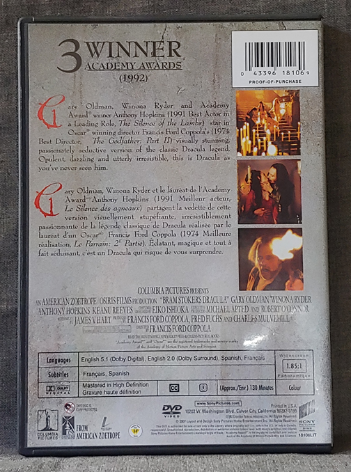 Bram Stoker’s Dracula – Starring: Gary Oldman, Winona Ryder, Anthony Hopkins, Keanu Reeves – Directed: Francis Ford Coppola – Used DVD – 130min. – Columbia Pictures 1992