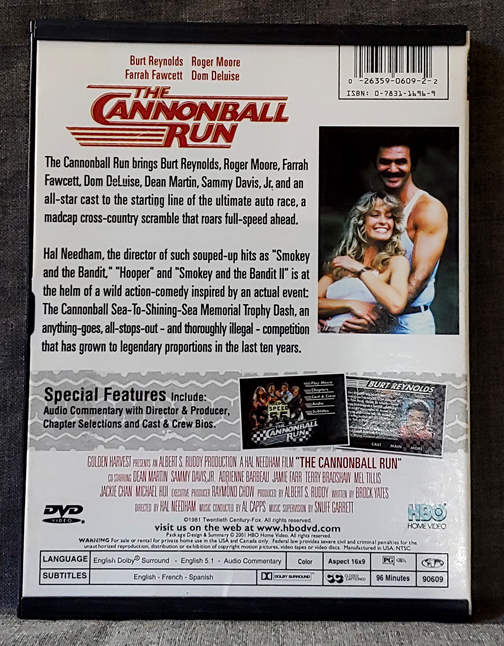 Cannonball Run – Directed: Hal Needham – Featuring Burt Reynolds, Roger Moore, Farrah Fawcett, Dom Deluise, Dean Martin, Sammy Davis Jr. – Used DVD – 96min. – HBO Home Video