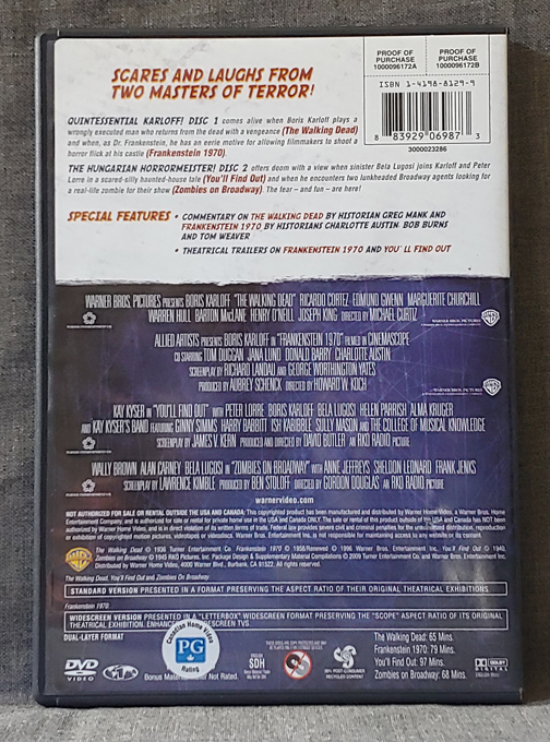 Karloff & Lugosi Horror Classics Collection – The Walking Dead – Frankenstein 1970 – You’ll Find Out – Zombies On Broadway – Used – 2 x DVD – Directed: Michael Curtiz, Howard W. Koch, David Butler, Gordon Douglas – Featuring Boris Karloff, Bela Lugosi – Warner Brothers – 2006