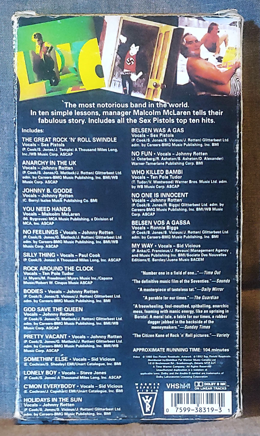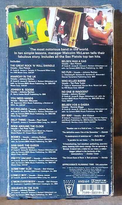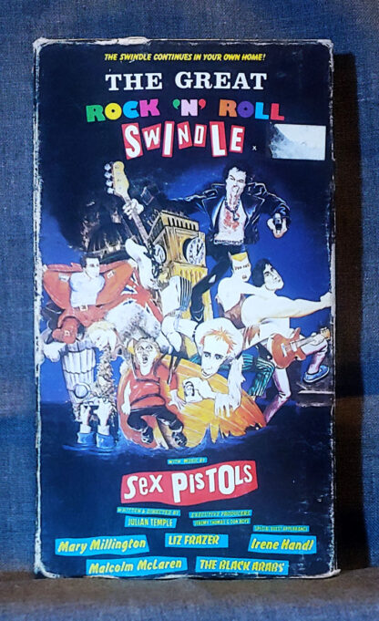 The Great Rock N Roll Swindle – 1980 – Featuring: Sid Vicious, Johnny Rotten, Mary Millington, Liz Frazer, Irene Handl, Malcom McLaren, Ronnie Biggs, Ten Pole Tudor, Paul Cook, and Sex Pistols – Pre-Owned VHS – Tested – 104 Min. – Warner RepriseĀ 1980